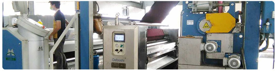 平幅進(jìn)布(帶液率約20%)→ 紅外擴(kuò)幅對中 → 德博仕-定型機(jī)助劑施加系統(tǒng)(帶液率約25%) → 下超喂 → 螺紋擴(kuò)幅 → 上超喂 → 剝邊 → 探邊 → 上針 → 漿邊 → 拉幅熱定形 → 冷風(fēng)冷卻 → 脫針 → 切,吸邊 → 冷水輥冷卻 → 擺式落布或卷裝落布