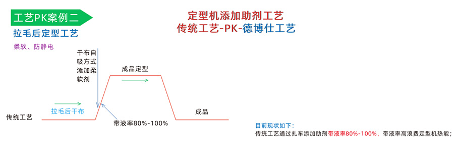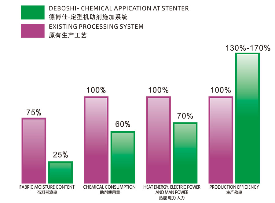 3、由德博仕-定型機(jī)助劑施加系統(tǒng)(帶液率約25%),代替原有二輥軋車(帶液率約75%),明顯降低了約50%帶液率。在兩者相同條件下,定型機(jī)效率可提高30%-70%、節(jié)約熱能、電力、人力約20%-50%、節(jié)約助劑約40%。
