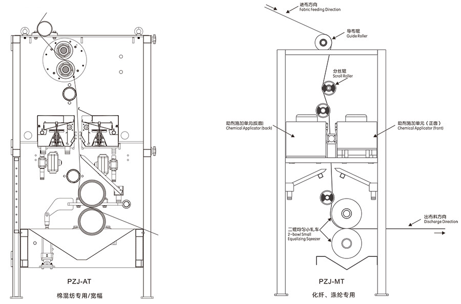 8、設(shè)備組合單元由:助劑施加單元正反面各一套、二均勻軋車一套、供液系統(tǒng)一套、控制電